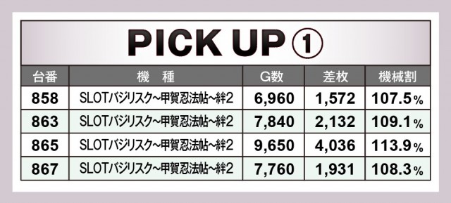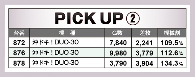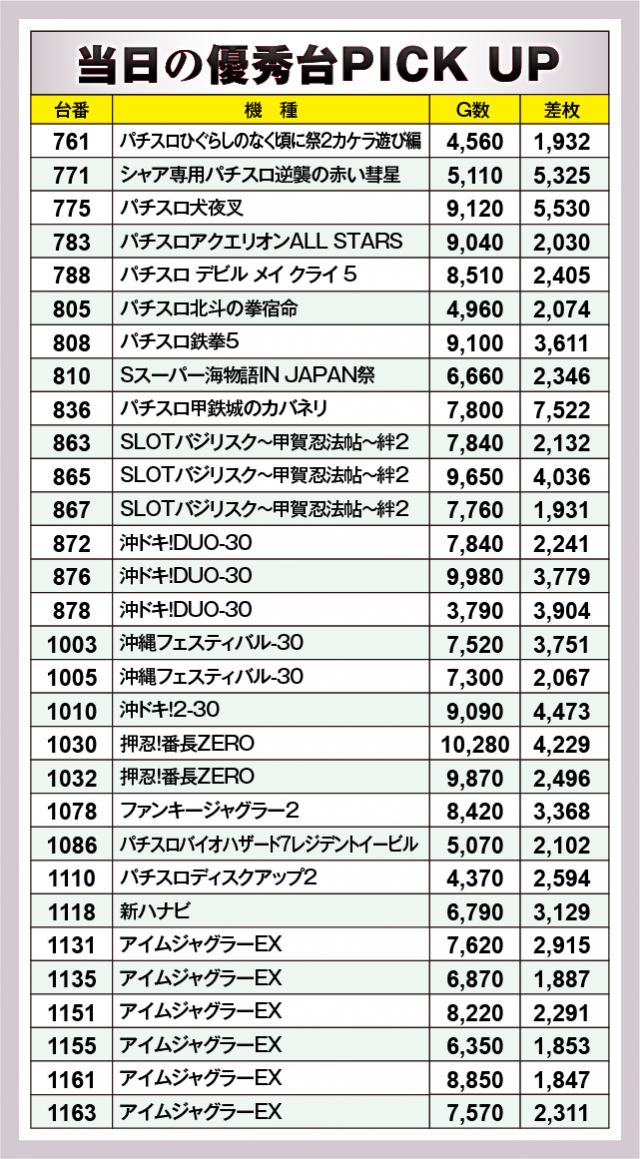 まずは優秀30台のPICK UPから。この日は30台中25台が差枚数+2千枚以上を達成!後述する好況スポット以外では、この日のトップ差枚数を叩き出した836番台の『パチスロ甲鉄城のカバネリ』が+7,522枚、次いで775番台の『パチスロ犬夜叉』が+5,530枚、さらに771番台の『シャア専用パチスロ逆襲の赤い彗星』が+5,325枚、そして1010番台の『沖ドキ!2-30』が+4,473枚を獲得!その他にも各所で凄まじい熱気が放たれていたのが窺える。