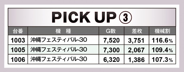 続いてはこの日の好調4機種に注目。まず『SLOTバジリスク~甲賀忍法帖~絆2』では865番台の+4,036枚を筆頭に好調3台トータル差枚数+8千枚オーバー!また『沖ドキ!DUO-30』『沖縄フェスティバル-30』では、共に差枚数+3千枚オーバーする台が見られた。そして『アイムジャグラーEX』では、差枚数+1千枚以上が多数出現し、好調11台トータル差枚数+2万枚以上と大いに盛り上がった!
