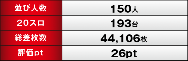 今回各所で輝きを放った結果、総差枚数+44,106枚と快勝し、連勝を飾ることに成功した。評価ptも26ptを獲得し、ファンの満足度が高かった1日だと言えるだろう。これからも勝利を積み重ね、さらにファンの期待に応え続けてほしいと願うばかりである!次回でもさらなる高みを目指し奮闘してほしい!