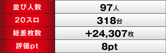 優秀台、ピックアップ機種の活躍もあって、トータルの差枚数は+24,307枚を記録。見事未連勝を達成した。ただ、全体的に見ると、評価ptはやや低めの8ptにとどまった。賑わいを見る限り、もう少し高いようにも感じたが、意外な結果となった。次回では、プラス差枚はますます多く、評価ポイントもさらにアップすることを期待するとしよう。