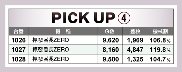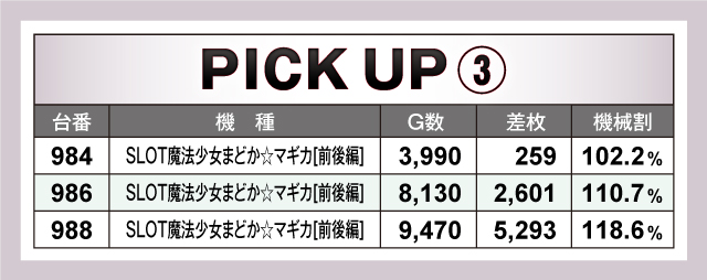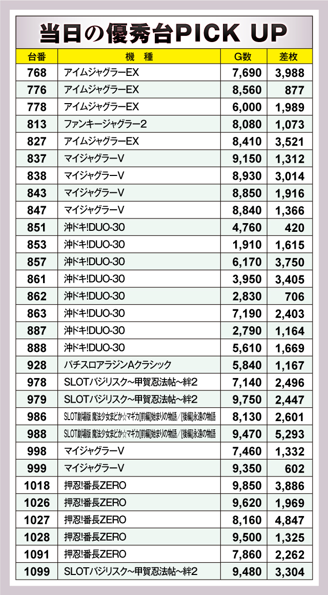 優秀台をチェックすると、まず目についたのが+5,2693枚を記録した『SLOT劇場版 魔法少女まどか☆マギカ[前編]始まりの物語/[後編]永遠の物語』の988番台。+5,000枚オーバーはさすがの一言。それに続いたのが+4,847枚の『押忍!番長ZERO』の1027番台。『番長ZERO』は、この他にも+3,886枚をマークした1018番台を出すなど、好調ぶりが目立った。以下、+3,988枚の『アイムジャグラーEX』768番台、+3,521枚の同827番台、+3,750枚の『沖ドキ!DUO-30』857番台、+3,405枚の同861番台、+3,304枚の『SLOTバジリスク〜甲賀忍法帖〜絆2』1099番台が盛り上がりを見せていた。