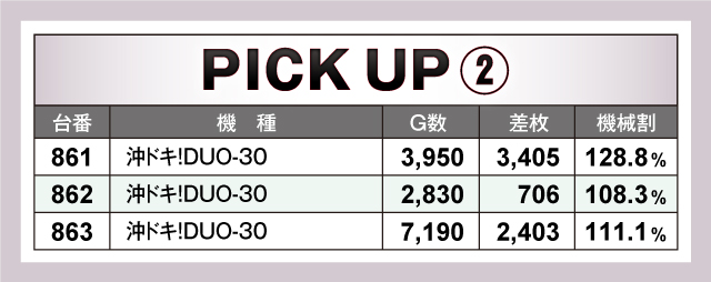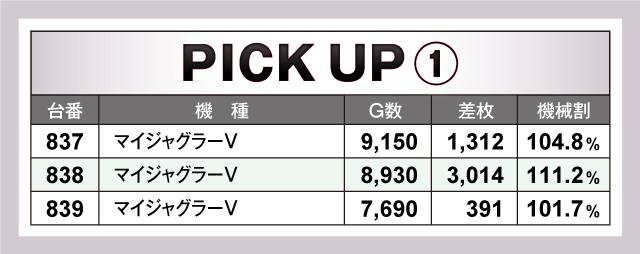 ピックアップ機種では、既出の『沖ドキ!DUO-30』、『SLOT劇場版 魔法少女まどか☆マギカ[前編]始まりの物語/[後編]永遠の物語』、 『押忍!番長ZERO』に加え、『マイジャグラーⅤ』が賑わいを見せていた。