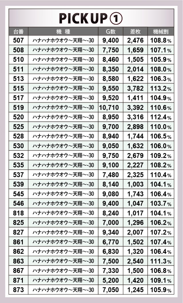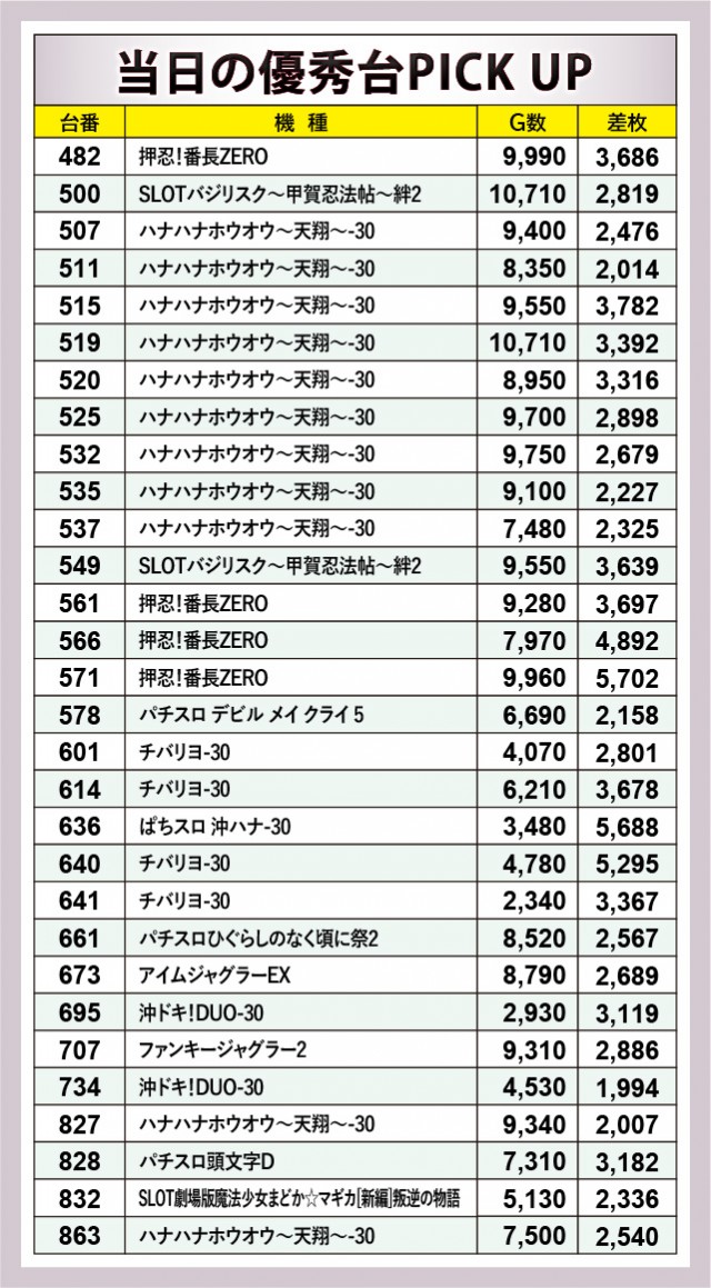 上表をご覧の通り、『ハナハナホウオウ~天翔~-30』『チバリヨ-30』『沖ドキ!DUO-30』といった沖スロ機種の躍進が大きく目立っていた。各台でドル箱が使用される光景が広がり、ハイビスカスの至高の輝きによって華やかな雰囲気にも包まれていたのが印象的だ。もちろん『押忍!番長ZERO』566番台+4,892枚や871番台+5,702枚など、人気を集めるAT機たちの活躍も見られ、館内全体が熱気に包まれていたと言える。