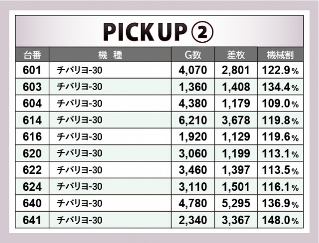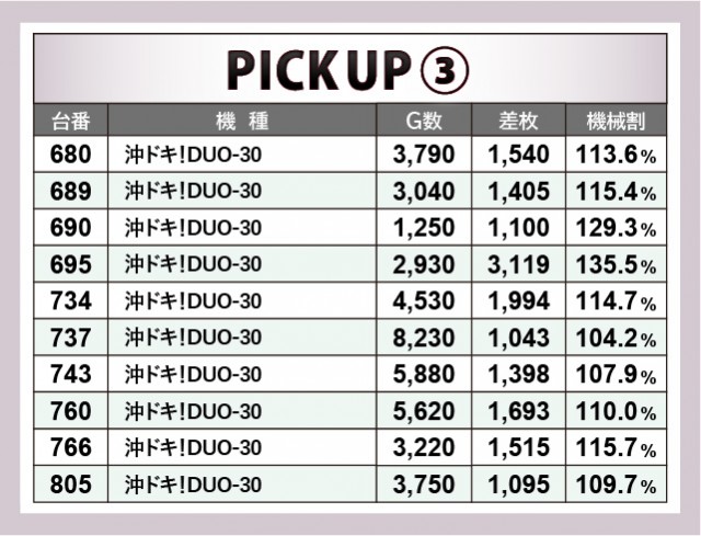 『ハナハナホウオウ~天翔~-30』は、1日を通して圧巻のパフォーマンスを披露していた。7~8回転OVERが目立つ内容で、中には万回転到達台も見られたことから、どれだけ多くのファンに信頼されているかが窺える。『チバリヨ-30』『沖ドキ!DUO-30』も負けておらず、特に『チバリヨ-30』は640番台+5,295枚を確認できるなど、凄まじい熱気を放っていたのも見逃せない。