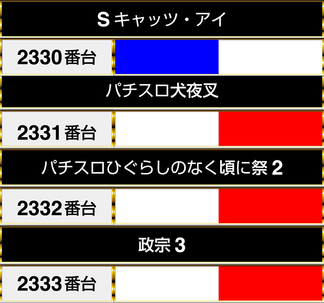 2331番台の『パチスロ犬夜叉』から2333番台の『政宗3』までも3台が並んでプラスptを記録した。