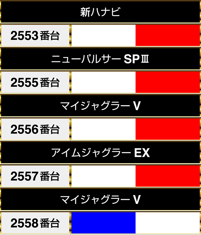 1日を通したデータをみると、『新ハナビ』の2553番台から『アイムジャグラーEX』の2557番台までが並んでプラスptとなった。