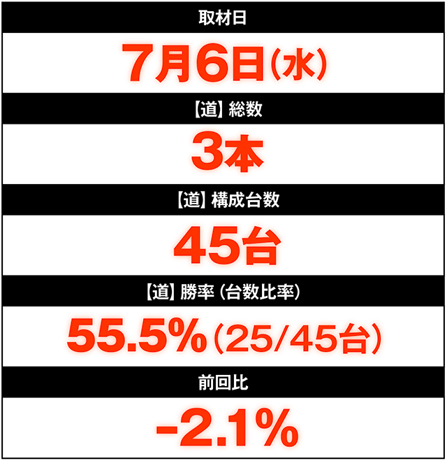 前回は5台もの【道】がパチスロコーナーに出現し、【道】構成台数は計59台と、大いに盛り上がりを見せてくれた。