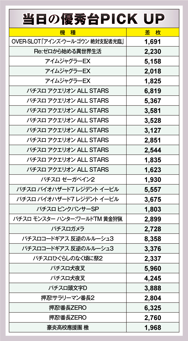 まずは、当日の優秀台をピックアップ! まず目に入るのが、『パチスロコードギアス 反逆のルルーシュ3』の+8,358枚。この日最高のプラス収支を叩き出した。さらに『パチスロ バイハザード7 レジデント イービル』や『押忍!番長ZERO』が余裕の+5,000枚超え。そのポテンシャルを思う存分発揮していた。