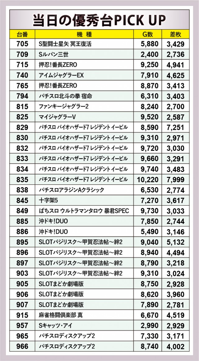 まずは優秀台からチェックすると、いずれも3千枚OVERが多発する熱狂ぶりが目に焼きつく。『SLOT劇場版 魔法少女まどか☆マギカ[前編]始まりの物語/[後編]永遠の物語』は905~907番台の3台横並びで好記録が発生し、まとまりのある出玉感にファンは興奮していたはずだ。他にも『ジャグラー』シリーズの名前を確認でき、さらに『沖ドキ!DUO』も活躍するなど、幅広い機種がしっかりと結果を残した格好だ。