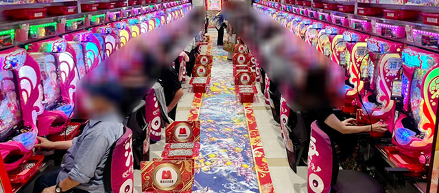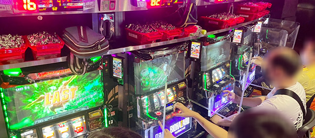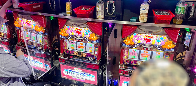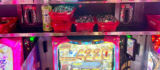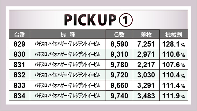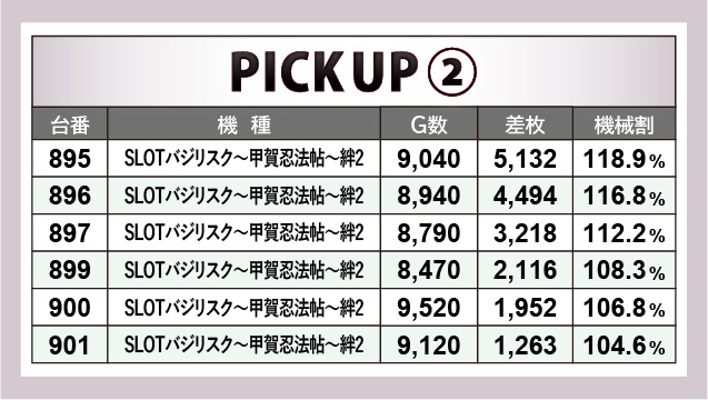 『パチスロ バイオハザード7 レジデント イービル』は829~834番台、『SLOTバジリスク~甲賀忍法帖~絆2』では895~901番台にて、6台横並びスポットが形成されていた。いずれも朝から閉店までじっくりと打ち込まれており、829番台+7,251枚という記録が鮮烈な印象を与える。また895番台+5,132枚・896番台+4,494枚といった大記録が連続するエリアもあり、複数のドル箱が使用される状況に思わず息をのんでしまうばかりだ。