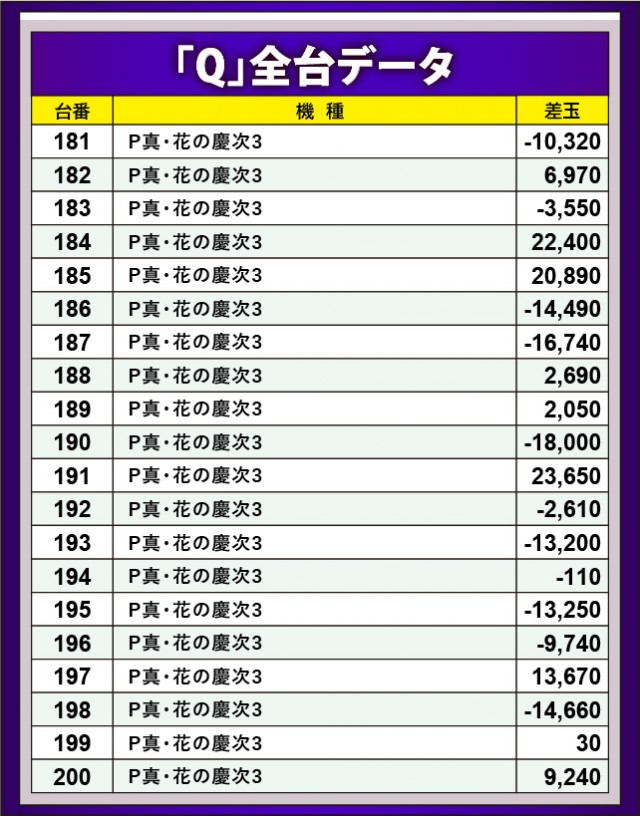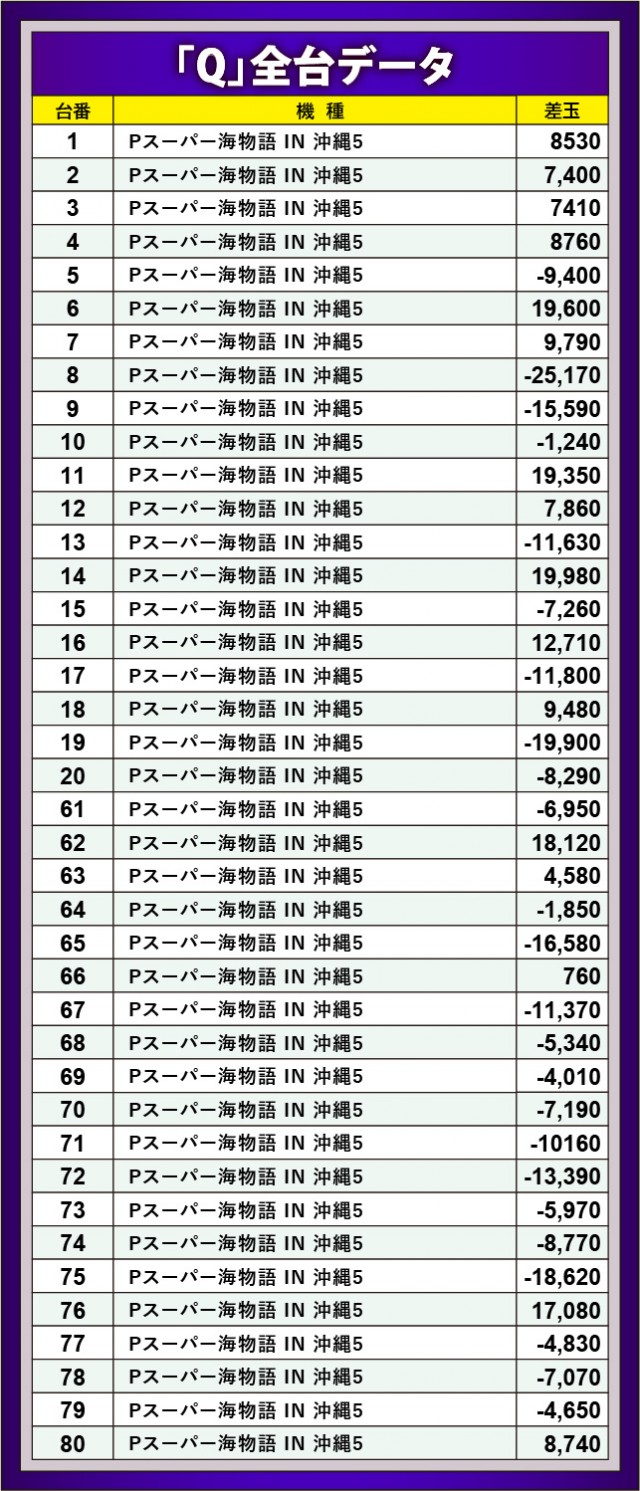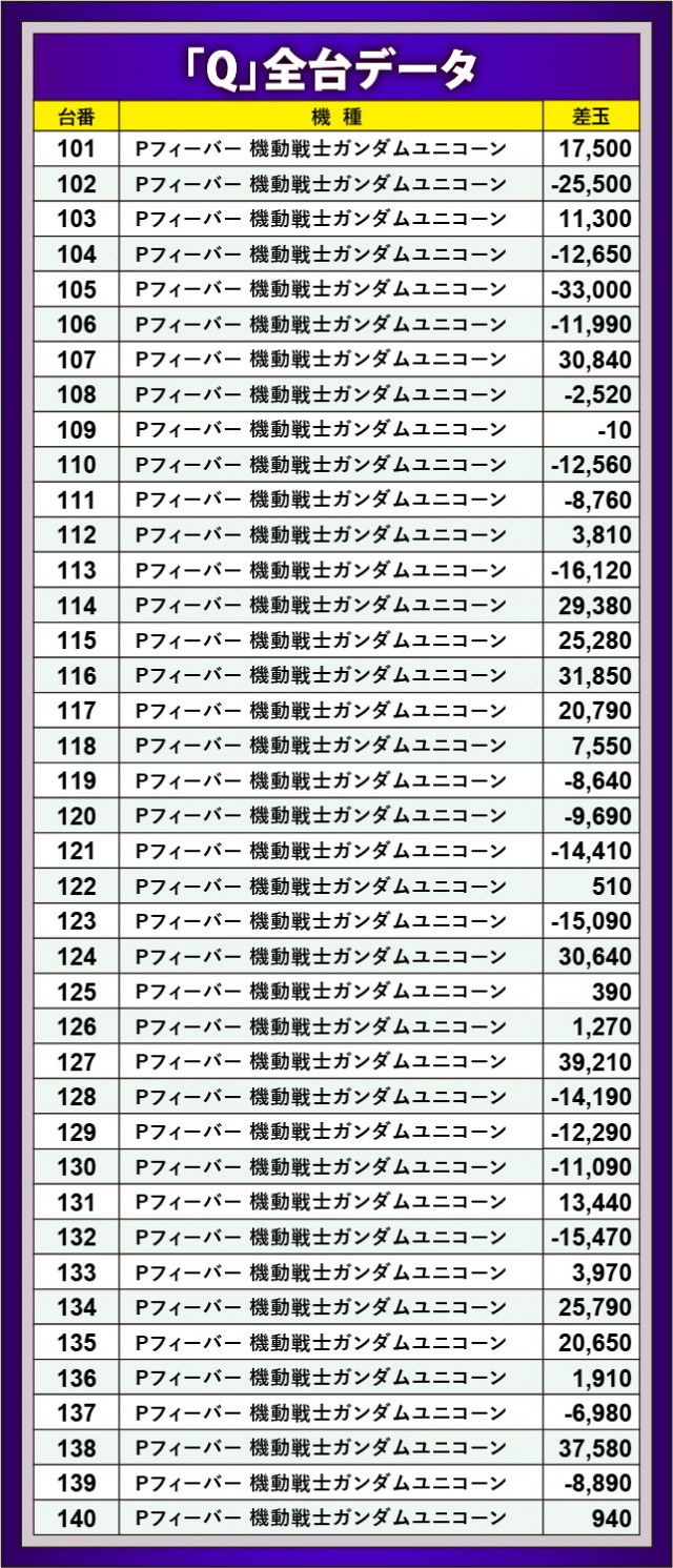 『Pスーパー海物語 IN 沖縄5』『Pフィーバー 機動戦士ガンダムユニコーン』『P真・花の慶次3』の3機種100台は、総差玉数をプラスで終える結果となった。個々の記録に目を向けると、やはり『Pフィーバー 機動戦士ガンダムユニコーン』が秀でた活躍を披露している。127番台+39,210玉・138番台+37,580玉のような突出した記録以外にも2万発オーバーが続出しており、同機種の力強さを感じずにはいられない内容だ。