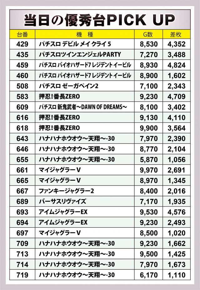 まずは差枚数+1千枚以上となった23台の詳細データをチェック。うち半数以上となる14台が+2千枚以上、+4千枚オーバーは4台となった。後述する好調2機種以外では+4千枚を突破した『パチスロ デビル メイ クライ 5』、+4千枚オーバー台を含め2台の合計が+6千4百枚超となった『パチスロ バイオハザード7 レジデント イービル』の成績が光った。またジャグラーシリーズにもプラス台が目立っていた。