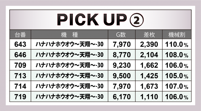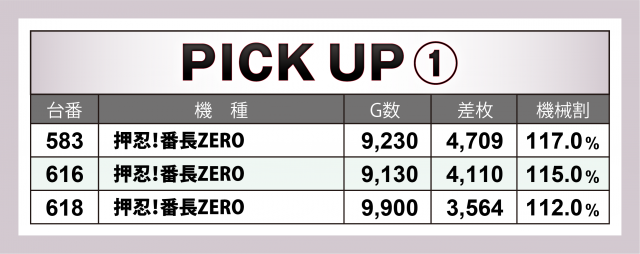 続いては当日好調だった2機種。『押忍!番長ZERO』は+4千枚超が2台ある中3台トータルで+1万2千枚をクリア、『ハナハナホウオウ~天翔~-30』は6台で+1万枚を突破した。