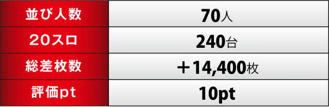 今回、全240台のトータル差枚数は+14,400枚と前回を上回っての連勝に成功。その一方で評価ptは前回よりも低下し、差枚数+1千枚超えの台は30を切ってしまった。次回実施時にはこの課題を乗り越えての連勝に期待したい。
