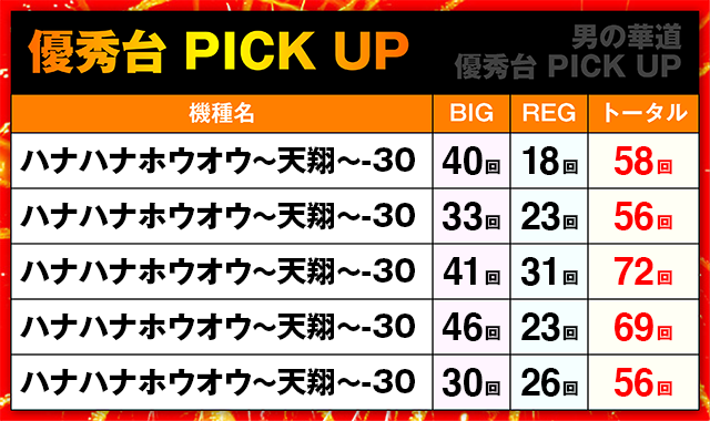 ボーナス回数72回の台をはじめ、「ハナハナホウオウ~天翔~-30」から5台の優秀台をチョイス!