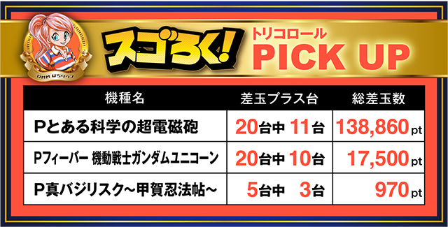 「パチスロコードギアス 反逆のルルーシュ3」や「パチスロ マクロスデルタ」などでも、5,000ptオーバーの台をみつけたぞ。