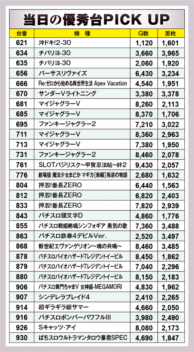 まずはこの日の優秀30台のPICK UPから。このうち6割が2千枚以上のプラス差枚数となり、後述する横並び好況スポット以外では、863番台の『パチスロ鉄拳4デビルVer.』が+3,497枚、次いで855番台『パチスロ戦姫絶唱シンフォギア 勇気の歌』が+3,488枚、更に僅差で868番台の『新世紀エヴァンゲリオン〜魂の共鳴〜』が+3,485枚など、様々な機種が盛り上がっていた。