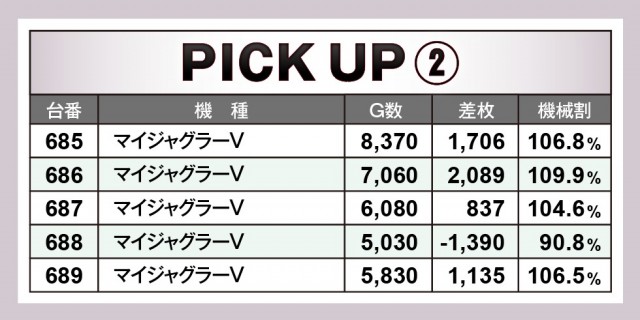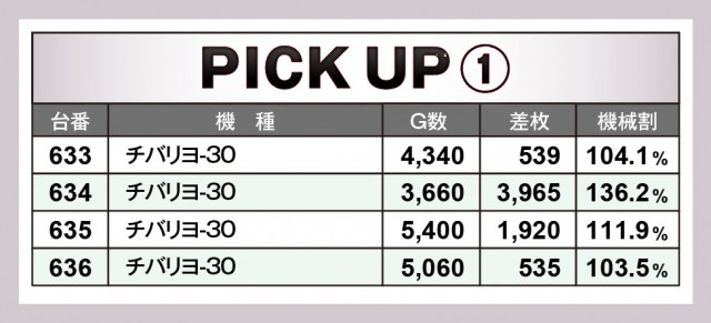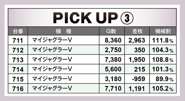 また、この日は2機種の横並び好況スポットが出現。まず『チバリヨ-30』では、+4千枚に迫る勢いの台を輩出!そして『マイジャグラーV』では、711番台の+2,963枚を筆頭に多台数がプラス差枚数を達成した。