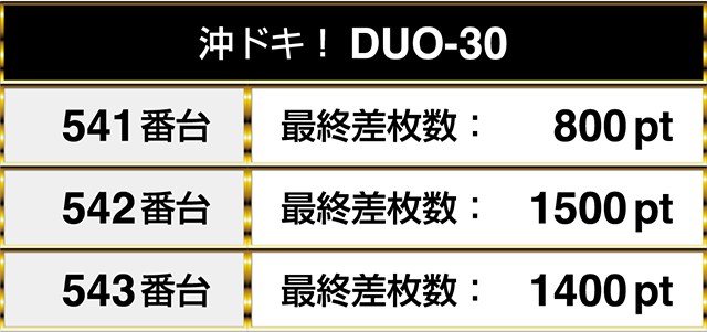 1500ptや1400ptなどがあった『沖ドキ!DUO-30』も3台が連なってプラスptを記録した。