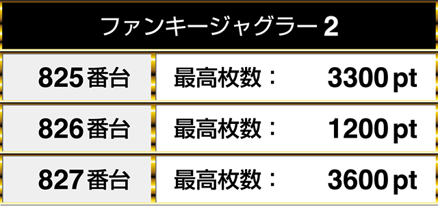 『ファンキージャグラー2』の3台が並んで1000pt以上となり、そのうちの2台は3000ptオーバー!