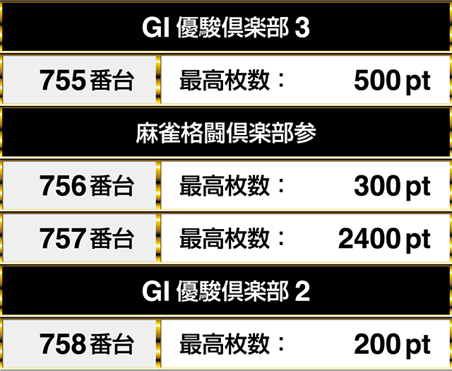 複数の機種を通してプラスptが連なる場所は、『GI優駿倶楽部3』と『麻雀格闘倶楽部参』、『GI優駿倶楽部2』にもあった。