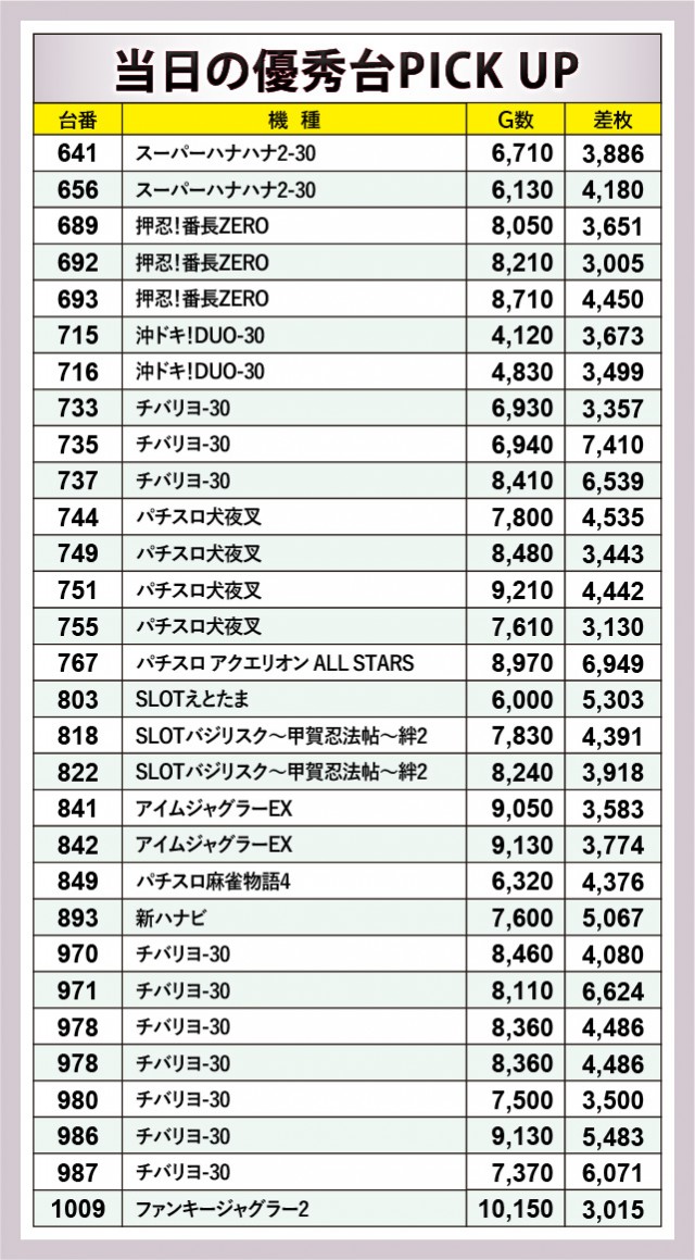 『チバリヨ-30』735番台+7,410枚が最高記録となり、他にも6千枚OVERが複数発生する大きな盛り上がりを見せた同店。他にも『SLOTえとたま』『新ハナビ』で5千枚OVERを確認でき、優秀台だけでも3千枚OVERが多く発生していたのが鮮烈だ。『押忍!番長ZERO』『SLOTバジリスク~甲賀忍法帖~絆2』など、全幅の信頼を置かれた人気機種たちの活躍も見られ、遊技したファンは相当な満足感を得ていたのではないだろうか。