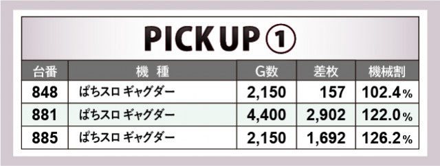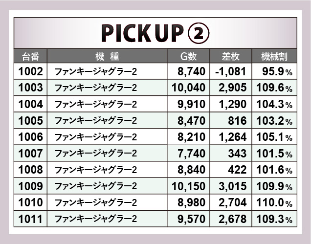 『ぱちスロ ギャグダー』『ファンキージャグラー2』は全台が好調さを披露しており、前者は全台プラス差枚を達成している。後者『ファンキージャグラー2』でも3千枚付近を叩き出す台が見られ、コンスタントなボーナス当選に頬を緩めるファンの姿が用意に想像できてしまうばかりだ。
