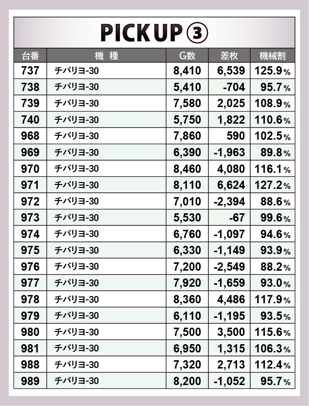 この日、鮮烈な活躍を披露していたのが『チバリヨ-30』である。968~981番台の並びが圧巻のパフォーマンスを見せ、971番台+6,624枚や978番台+4,486枚といった記録に目を奪われてしまう。各所で凄まじい熱気を放ち、ハイビスカスが燦然と輝く光景には、誰もが驚きを感じていたのではないだろうか。