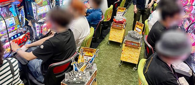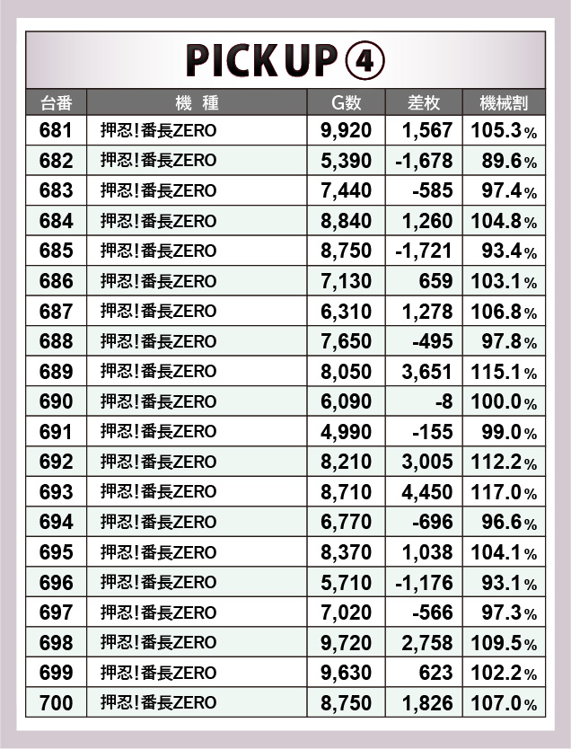 『押忍!番長ZERO』もまた全台が輝きを放っていた。大きなマイナスを記録する台が少なく、それでいて693番台+4,450枚など大量獲得に成功する台が多かったのがなによりも好感を覚えるポイントだ。回転数を見ても朝からじっくりと遊技された形跡を確認でき、ファンは有意義な時間を過ごせたはずだ。