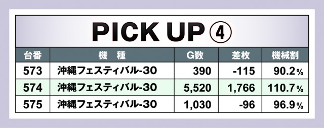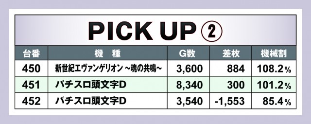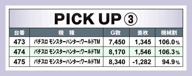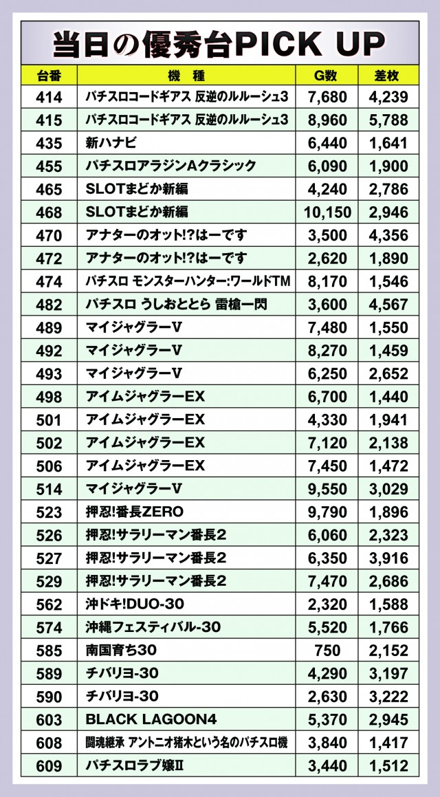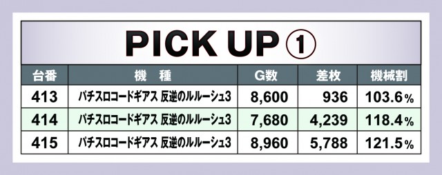 ピックアップは4つ。今回の「英雄の軌跡~ヒーローズレポート~」で一番の差枚数を叩き出したのは『パチスロコードギアス 反逆のルルーシュ3』となった。414番台、415番台は申し分ない差枚数と言えよう。残りのピックアップはいずれもパッとしない結果が並んでいるが、台番が並んでいるのにも注目! もしかしたら、3台並びだった可能性もあるぞ。