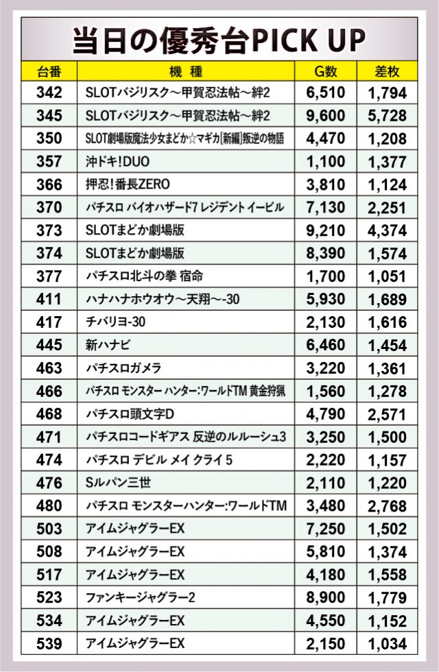 まず優秀台からチェックするとAT機やノーマル機、沖スロ機種のそれぞれが名を連ね、館内全体が熱気に包まれていたことが如実に窺えるだろう。その中で秀でた活躍をしたのが『SLOTバジリスク~甲賀忍法帖~絆2』『SLOT劇場版 魔法少女まどか☆マギカ[前編]始まりの物語/[後編]永遠の物語』の2機種。続いて『パチスロ頭文字D』『パチスロ モンスターハンター:ワールドTM』といったバラエティー機種も奮闘し、ファンたちは有意義な時間を過ごしていた。