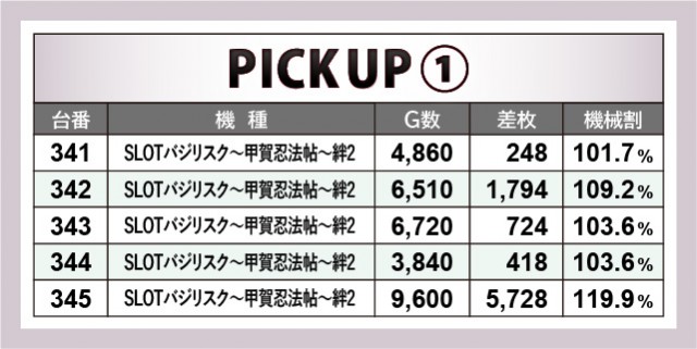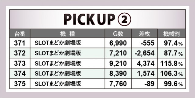 『SLOTバジリスク~甲賀忍法帖~絆2』『SLOT劇場版 魔法少女まどか☆マギカ[前編]始まりの物語/[後編]永遠の物語』は各5台・合計10台がポテンシャルを披露していた。前者では345番台+5,728枚という記録が生まれ、後者でも373番台+4,374枚という数字が鮮烈な印象を与える。2機種の全台系は朝から打ち込むファンの姿があり、早々に手ごたえを感じると、最後までレバーを叩く力が強かったのも目に焼きついた光景だ。