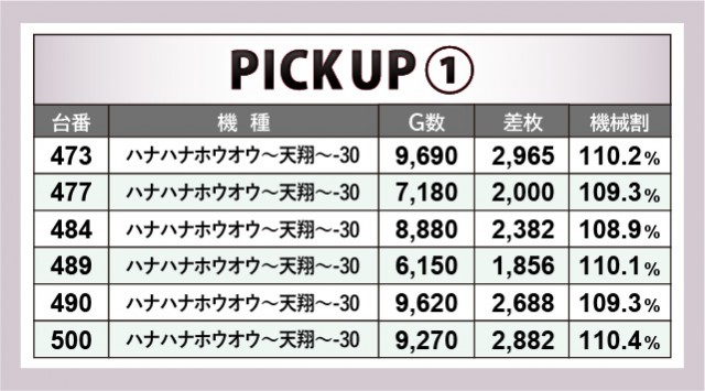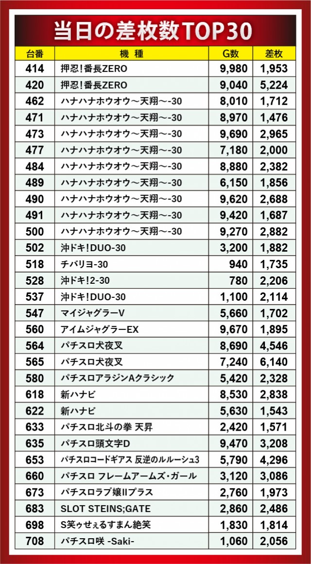 最多設置を誇る『ハナハナホウオウ~天翔~-30』の活躍に目を奪われるばかりで、2千枚OVERが多発していたのが何よりも鮮烈であるばかり。沖スロコーナーの盛り上がりを牽引しており、その一方でAT機からは『押忍!番長ZERO』420番台+5,224枚という数字も印象的だ。『パチスロコードギアス 反逆のルルーシュ3』『パチスロ頭文字D』など、各機種でしっかりと結果を出しており、遊技していたファンは高い満足度を示していた。