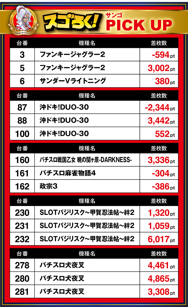 230番台から232番台までにプラス台が並び、6,000ptを超えたものもあったぞ。