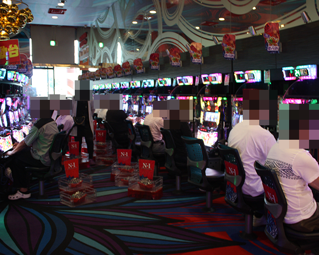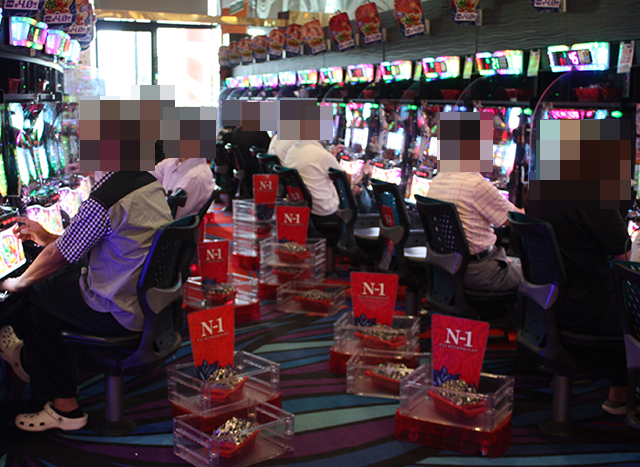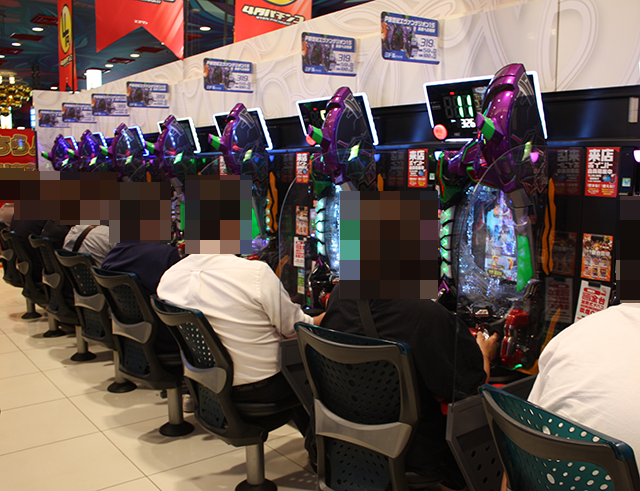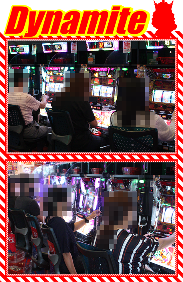 持ち玉が1箱以上となっている台も多く、シマ全体に華やかな光景が広がっていた。