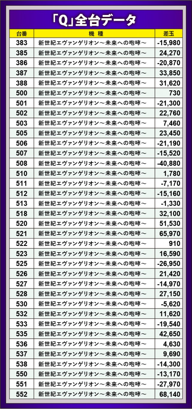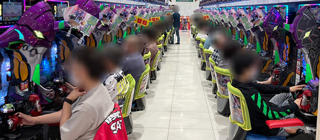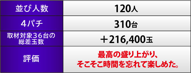 現行機のなかでも屈指の人気を誇る『新世紀エヴァンゲリオン〜未来への咆哮〜』。朝から多くのファンが着席し、力強くハンドルを握りしめていたのは言うまでもないだろう。そんな活気が満ちるなか、552番台+68,140玉を筆頭に、521番台+65,970玉が発生するなど大きく盛り上がっていた。また4~5万発OVERも当然のように発生し、圧倒的なプラスで終えた台が多く見られたのが印象的だ。