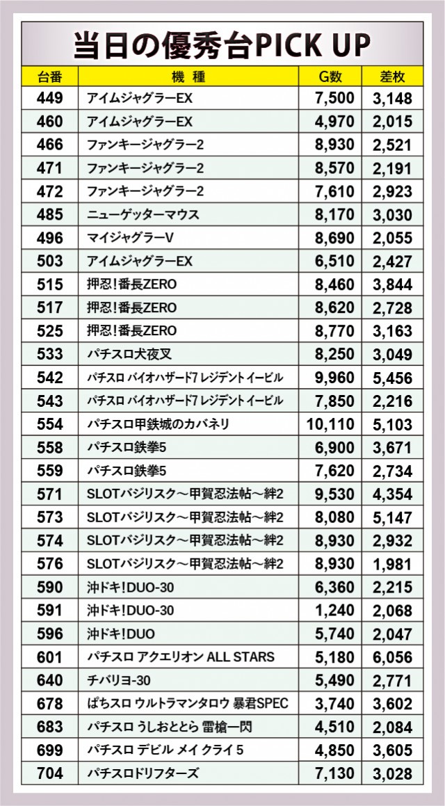 『押忍!番長ZERO』『SLOTバジリスク~甲賀忍法帖~絆2』など、変わらず高い人気を誇る機種の活躍が目立っていた。加えて『パチスロ犬夜叉』『パチスロ甲鉄城のカバネリ』など6.5号機の奮闘も見らる。『パチスロ アクエリオン ALL STARS』601番台+6,056枚が最高記録、他にも3千枚OVERが多発するなど、館内全体が盛り上がっていたのが印象的だ。