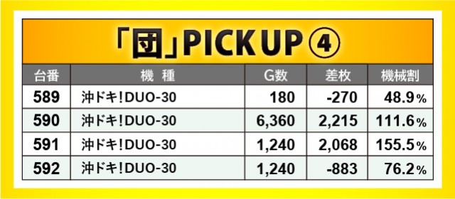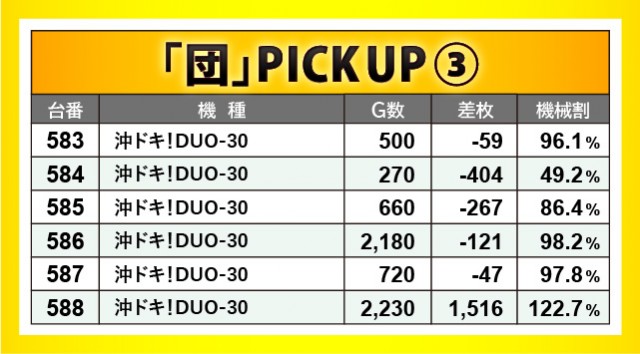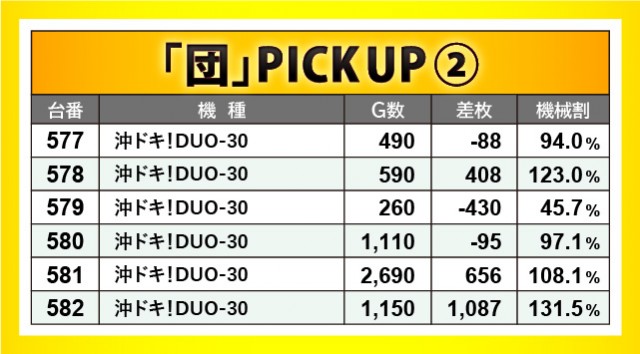 『沖ドキ!DUO-30』では3か所の横並びスポットを確認できた。しかし全体的に低調だったことから、数字は物足りなさを感じずにはいられない。590番台+2,215枚・591番台+2,068枚といった記録が発生していたことから、全台がしっかりと回されていれば、より大きく盛り上がっていたのは必然だろう。