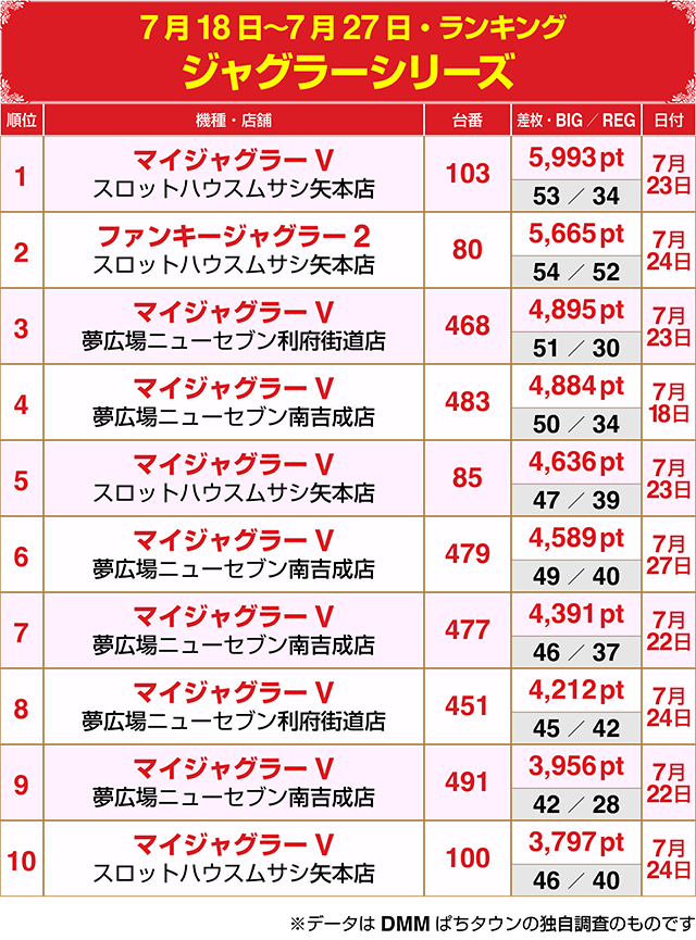 大人気の『マイジャグラーV』から9台がランクイン!!