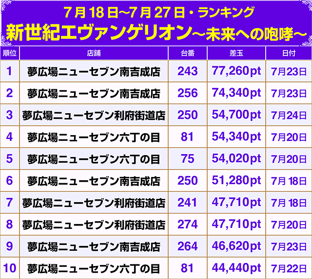 地域最大級の設置台数を誇る『新世紀エヴァンゲリオン~未来への咆哮~』のTOP10を公開!!