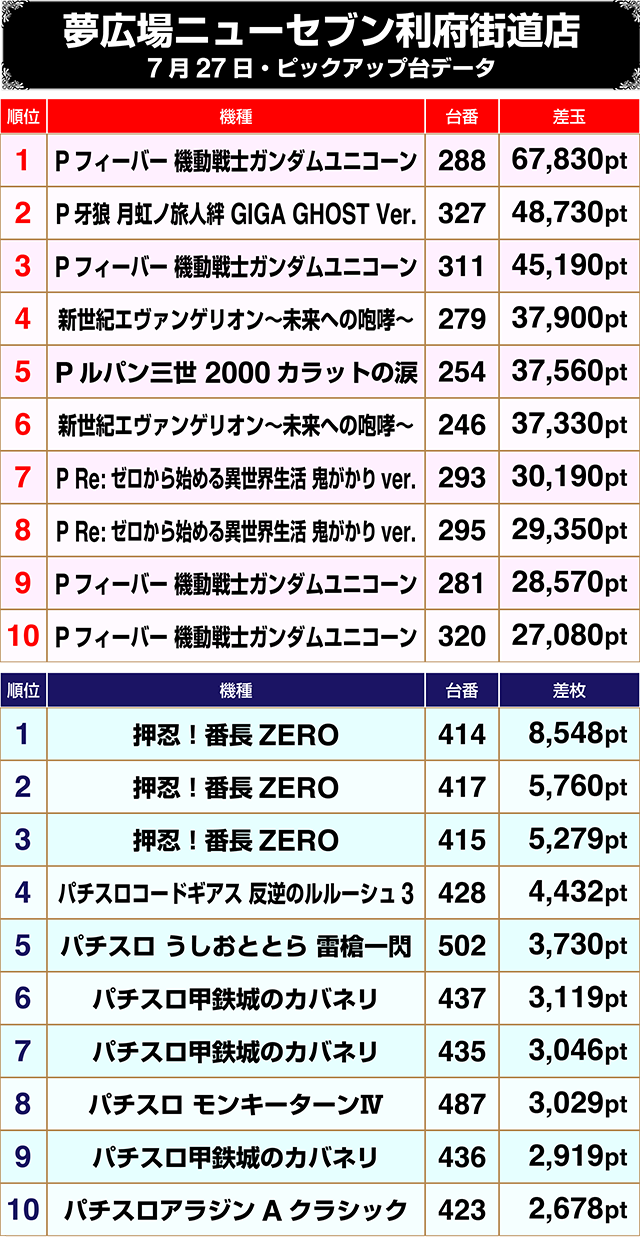 417番台をはじめ、『押忍!番長ZERO』の3台が+5,000ptオーバー!!