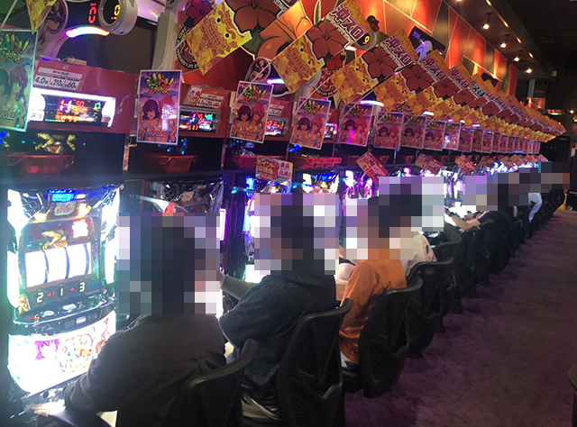 昼頃になると、定番機種や沖スロで構成されているシマが盛況。