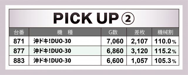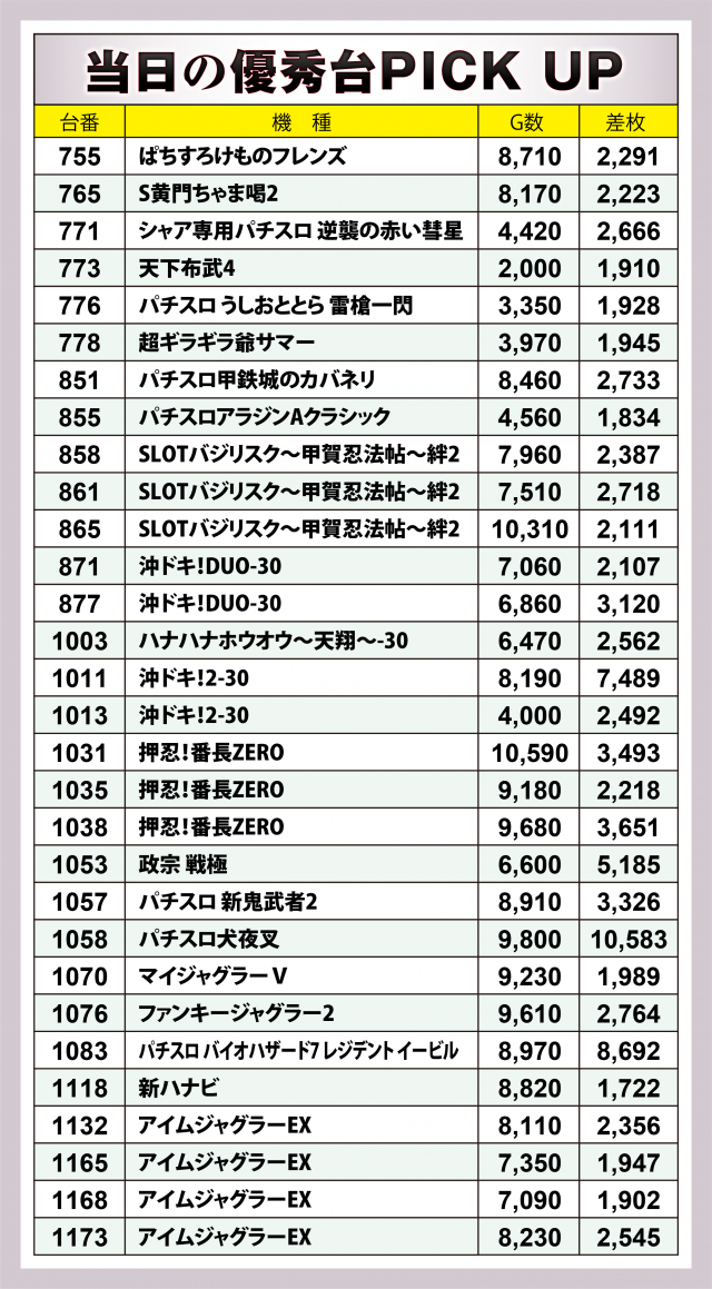 まずは当日の優秀30台PICK UPから。この日は22台が差枚数+2千枚以上を達成。後述する好調4機種以外では、全国的に出玉の猛威を振るう6.5号機の『パチスロ犬夜叉』に万枚突破台が出現、それに次いで+8千枚オーバーの『パチスロ バイオハザード7 レジデント イービル』、+7千枚強の『沖ドキ!2-30』、+5千枚を記録した『政宗 戦極』の成績が輝いた。