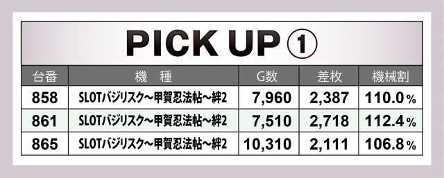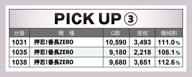 続いてはこの日好調だった4機種に密着。全15台全てが四桁の差枚数を達成。『SLOTバジリスク~甲賀忍法帖~絆2』『押忍!番長ZERO』『沖ドキ!DUO-30』『アイムジャグラーEX』といった定番人気機種が安定の出玉を残した形となった。