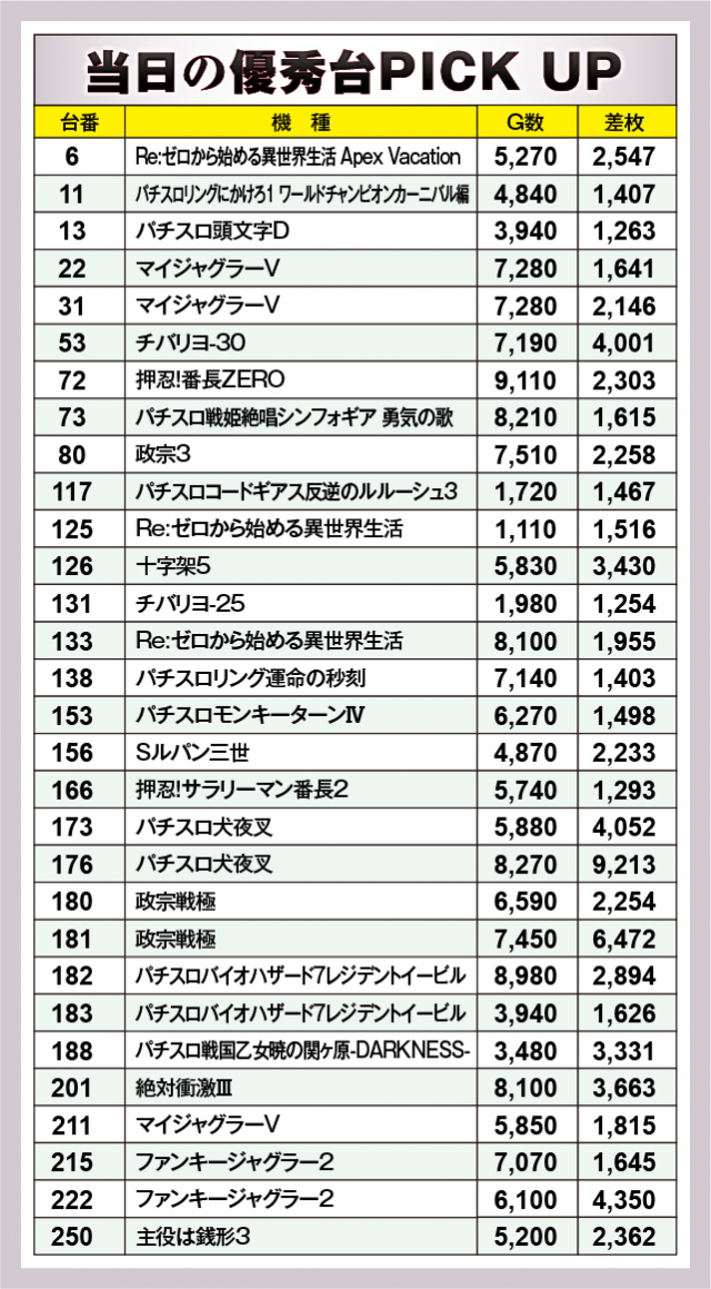 まずは優秀30台のPICK UPからチェック。この日は30台のうち16台が差枚数+2千枚以上となった。後述する好調3機種以外では、222番台の『ファンキージャグラー2』で+4,350枚を筆頭に、53番台の『チバリヨ-30』で+4,001枚、さらに201番台の『絶対衝激Ⅲ』で+3,663枚、そして126番台の『十字架5』で+3,430枚を獲得し、様々な機種が活躍していた!