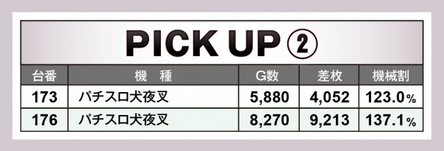続いては、横並び好況スポットを含む好成績を残した3機種に注目! まず、『マイジャグラーV』では+2千枚超えを記録した台もあり、好調5台のトータル差枚数は+7千枚越えとノーマル機の安定感を見せつけた。また『パチスロ犬夜叉』では、この日トップに輝いた176番台の+9,213枚や、173番台の+4,052枚が目立っていた。そして、横並びで好況だったのが『政宗 戦極』で差枚数+6千枚越えがみられた。