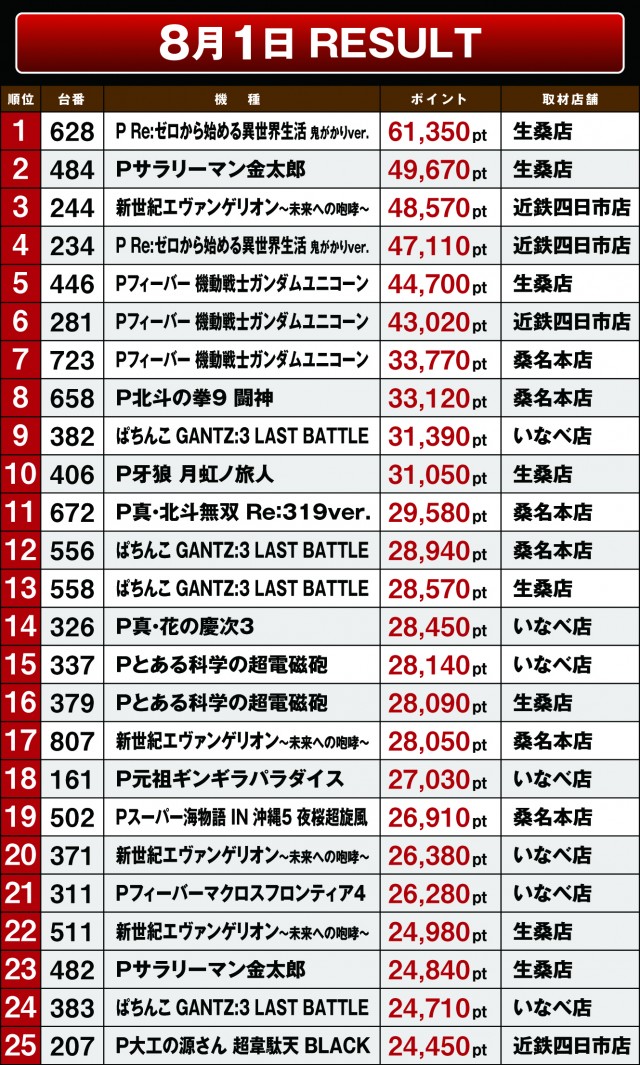 8月一発目の王様伝説はご覧の通り! 『新世紀エヴァンゲリオン~未来への咆哮~』や『Pフィーバー 機動戦士ガンダムユニコーン』などの人気機種はこれまで同様に多数の優秀台が散見される状況だ。そして、今回も新機種に注目したいところ。『Pサラリーマン金太郎』と『ぱちんこ GANTZ:3 LAST BATTLE』の2機種が6台も優秀台に! 前者は突入率高めの1種2種混合機、後者はこれまでのシリーズ同様に小当りRUSHが鍵を握る確変ループスペックとなっている。メインを張れる機種になれるのか。今後の動向も要チェックだ!