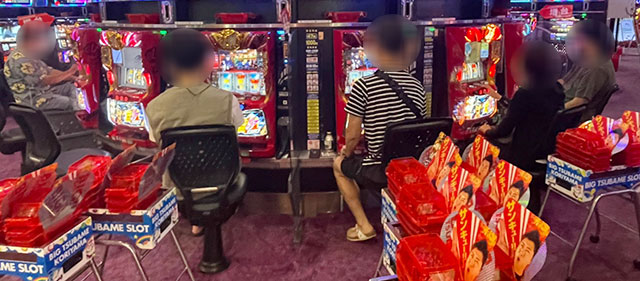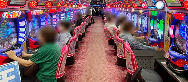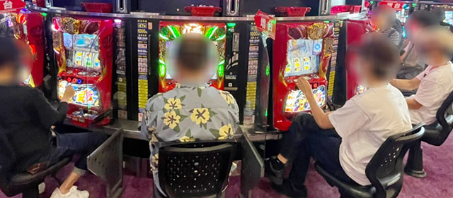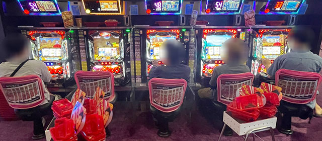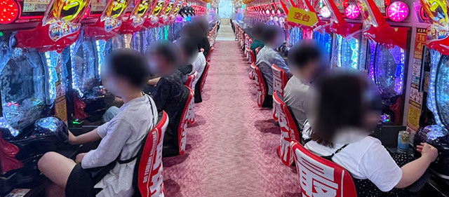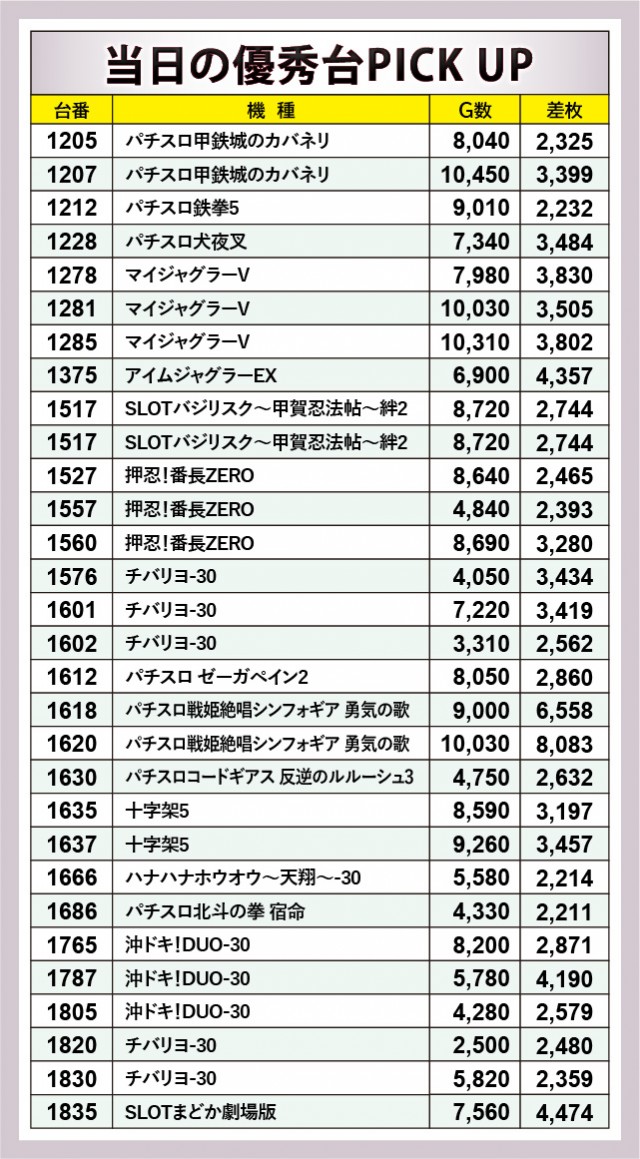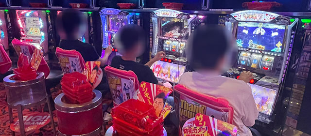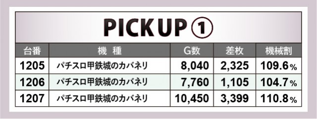 パチスロコーナーは万回転OVERが多く見られ、朝から閉店まで存分に楽しまれていた様子が窺える。『パチスロ甲鉄城のカバネリ』をはじめとした6.5号機を筆頭に、『SLOTバジリスク~甲賀忍法帖~絆2』『押忍!番長ZERO』など従来の人気機種への信頼は厚い。差枚数に関しては『パチスロ戦姫絶唱シンフォギア 勇気の歌』1618番台+6,558枚・1620番台+8,083枚と大記録が生まれ、館内の盛り上がりを牽引していた。
