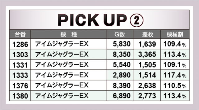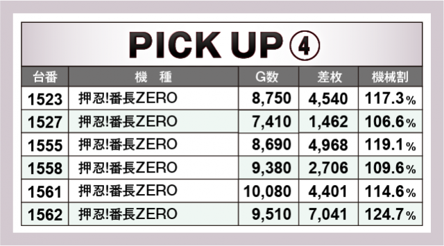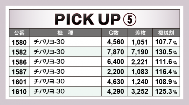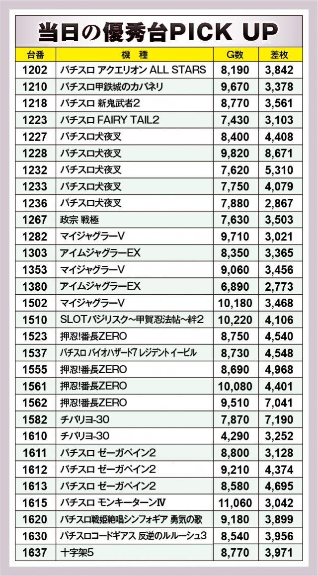 ピックアップされた優秀台30台をチェックすると、全台的に3千枚OVERが多発していたことが分かる。後述する好調5機種以外では、1613番台の『パチスロゼーガペイン2』で+4,695枚を獲得し、次いで1537番台の『パチスロバイオハザード7レジデントイービル』が+4,548枚、そして1510番台の『SLOTバジリスク~甲賀忍法帖~絆2』が+4,106枚と目立っていた。他の機種も負けじと活気と熱気を放ち、盛り上がりが窺える内容になっている。