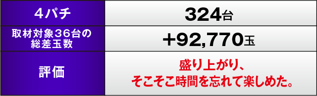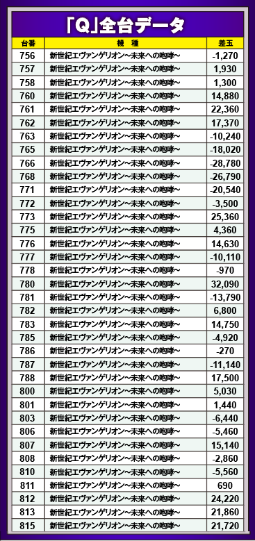 続いては4パチもチェックしていこう。ファンから絶大な信頼を寄せられている『新世紀エヴァンゲリオン〜未来への咆哮〜』で、780番台の+32,090玉を筆頭に、各所で万発OVERが複数発生していた。しっかりとプラス差玉を記録している台の多さにポテンシャルの高さを感じずにはいられない!